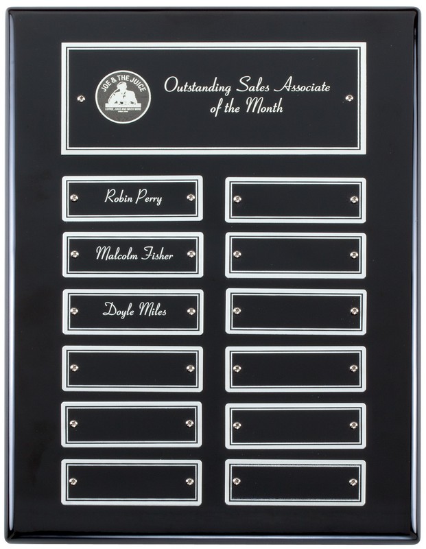 P5062 Black stained piano finish perpetual plaque with 2 plate combinations 9 ” x 12 “.